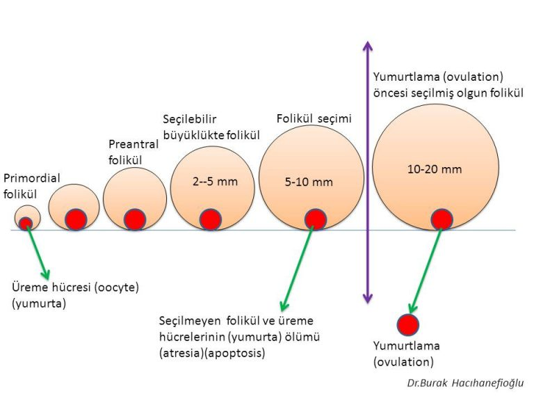 Bir adet döngüsünde (menstrual cycle) üreme hücresini (oosit) içinde taşıyan küçük foliküllerden (antral) (5-10 mm) bir tanesi seçildikten sonra yumurtlama öncesi olgun folikül (dominant) (20 mm) halini almaktadır(10,11,12,13,35,37). Yumurtlama (ovulasyon) bu folikül içinden üreme hücresinin (oosit) dışarıya çıkmasıyla oluşmaktadır(10,11,12,13).
