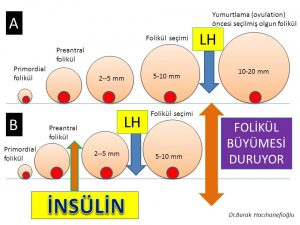 Polikistik over sendromu olan kadınların bir kısmında insülin direncine bağlı fazla miktarda üretilen insülin (hiperinsülinemi) hormonu ile fazla miktarda üretilen LH (luteinizing hormon) alıcılara (receptors) tutunarak folikül seçimi aşamasına (5- 10 mm) gelmiş foliküllerin yumurtlama (ovulation) öncesi (preovulatory) olgun folikül (dominant) aşamasına ulaşmadan erken dönemde büyümesinin durmasına (premature arrest) neden olmaktadır(28,29,138,149,150,151,152). Bu nedenle folikül seçimi aşamasına (5-10 mm) gelmiş foliküllerden bir tanesi seçilerek daha ileri aşamaya geçememektedir (arrested follicles). Bunun sonucunda da yumurtlama olmamaktadır (anovulasyon)(28,29,151).
