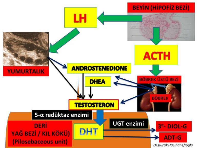 2-Erkeklik hormonlarının (testosteron, dihidrotestosteron) büyük bir kısmı böbrek üstü bezinde (Adrenal Gland) üretilen DHEA ve Androstenedione hormonlarını hammadde olarak kullanarak kıl kökleri ve yağ bezlerinin bulunduğu deri gibi aynı zamanda erkeklik hormonlarının (testosteron, dihidrotestosteron) hedefi olan organlarda üretilirken ancak küçük bir kısmı yumurtalık ve böbrek üstü bezinde üretilmektedir (Intracrinology)(8,9).