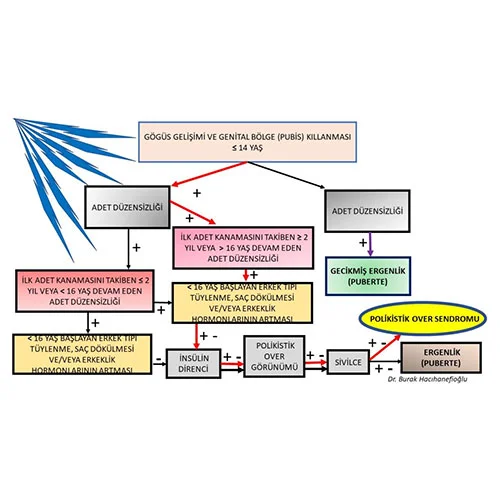 2-Göğüs gelişimi başlamış, genital bölge kıllanması var, ama ilk adet kanaması henüz olmamış bir kızda erkek tipi tüylenme artışı, saç dökülmesi, şişmanlık-kilo fazlalığı var ise polikistik over sendromu açısından adet düzensizliğinin 16 yaşından önce araştırılması gerekir. Polikistik over sendromu’na bağlı olarak adet kanamasının gecikmesi veya adet olamama şikayeti olan 16 yaşından küçük kızlarda Anti-Mullerian Hormon (AMH) miktarı fazla bulunmaktadır (4).